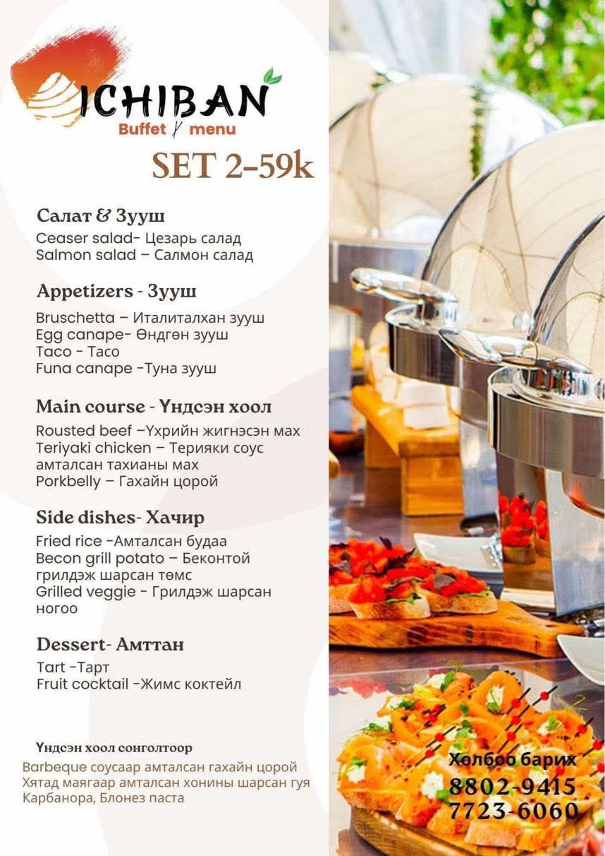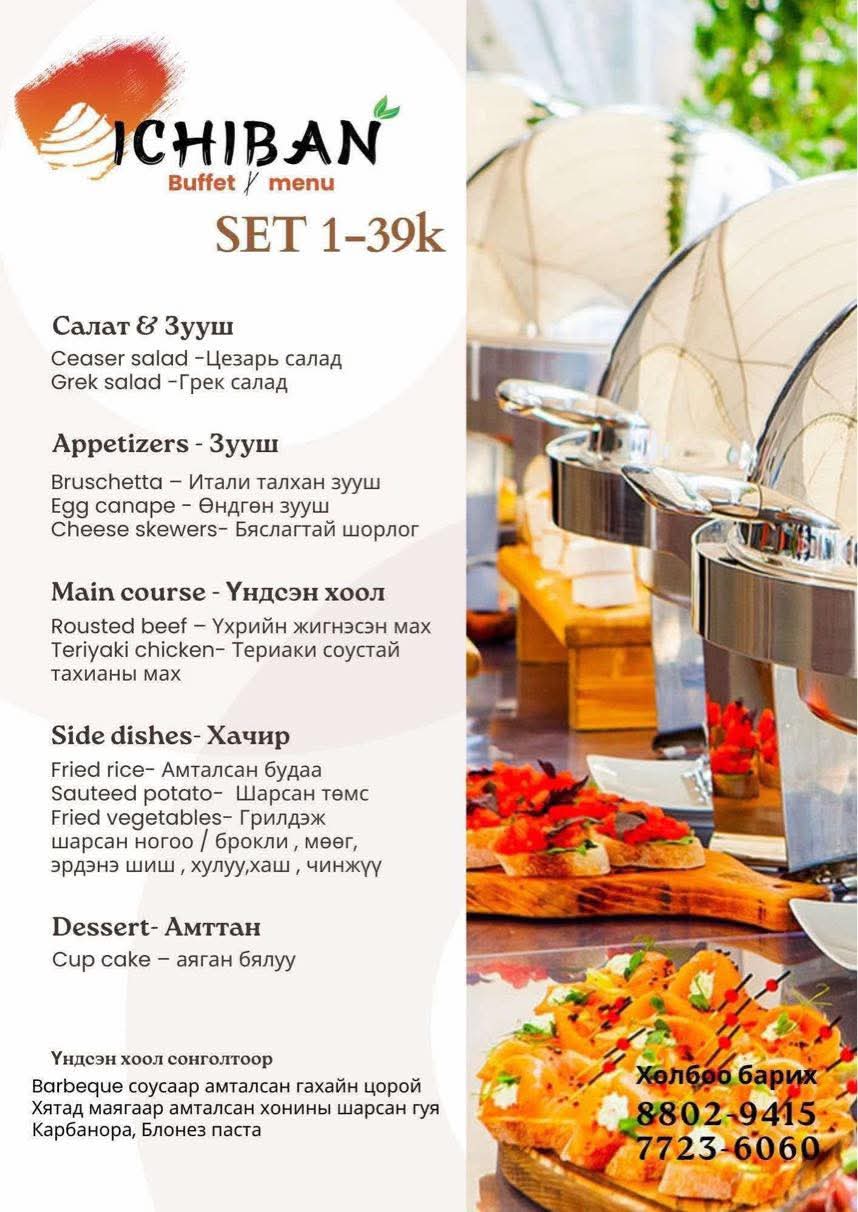 Манай Ichiban Sushi Bar, catering байгууллага Олон улсад мэргэшсэн, өндөр туршлагатай хүмүүсээр багаа бүрдүүлсэн манай хамт олон 2021-2022 онд Playtime хөгжмийн фестиваль, Spirit of Gobi, Hot Music Festival, Max Road Naadam, Teso Group наадам зэрэгт 600 гаруй катерингийн үйлчилгээ үзүүлж, манай компанийн нэр хүнд үйл ажиллагаа явуулдаг Ichiban Sushi Bar нэгдсэнээс хойш эхний 1 сард л зөвхөн хоол борлуулалтаар нөхө төлөв байгууллага болсон амжилттай байна.